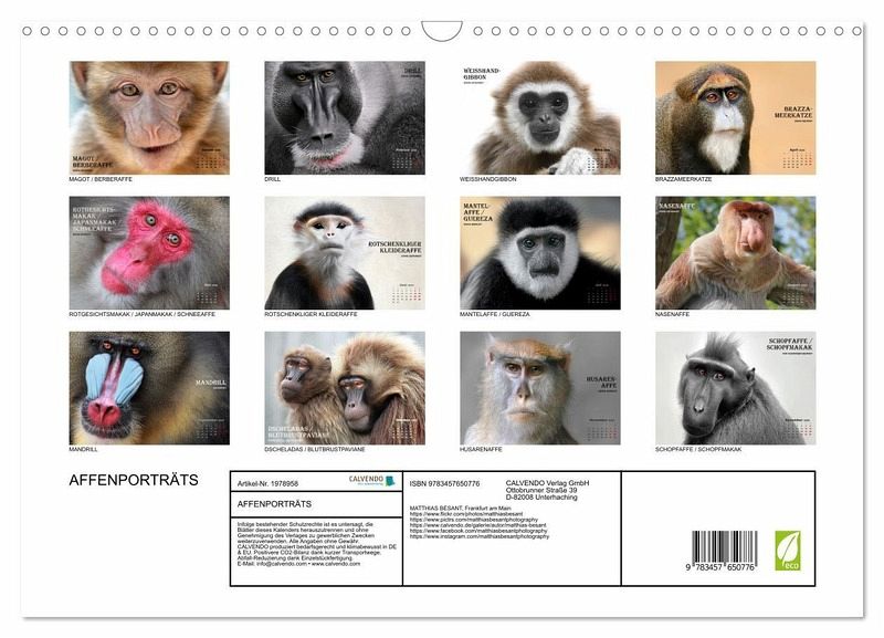 QUALITÄT - Hochwertiger Fotokalender mit 12 wunderschönen Motiven auf lichtbeständigem Bilderdruckpapier, robuste Spiralbindung mit Aufhängebügel.NACHHALTIG - deutliche Abfallreduzierung durch bedarfsgerechte Einzelstückfertigung, umweltfreundliches FSC-zertifiziertes Papier, Produktion in Deutschland, klimabewusste Logistik.PERFEKTES GESCHENK - Kalender für Freunde und Familie, für Kinder und Erwachsene, jung und alt, zu Weihnachten, Geburtstag oder zwischendurch.VIELFALT - Bildkalender in verschiedenen Formaten, z.B. DIN A5, DIN A4, DIN A3 sowie DIN A2. Ob Naturmotiv, Gemälde oder Fotos, ideal für ein persönliches Wohlfühlambiente.Fotos von vorwiegend bedrohten Altweltaffen. von Autor(in): Matthias Besant