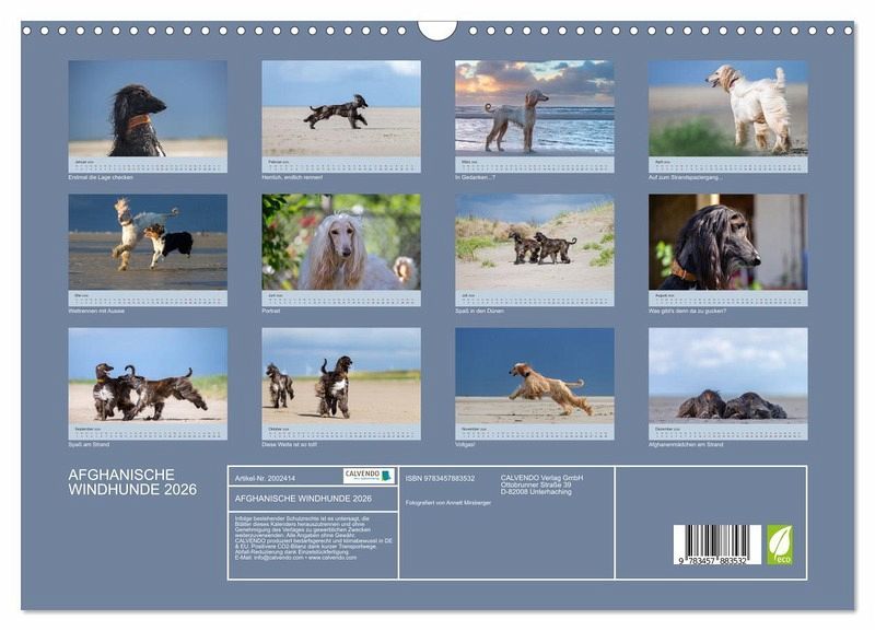 Begleiten Sie diese Schönheiten und freuen Sie sich an der Freiheit und Lebensfreude, die diese Hunde am Strand und in der Natur genießen - ein Spaziergang durch's Jahr, nicht ganz so schnell, wie diese wunderschönen Windhunde...