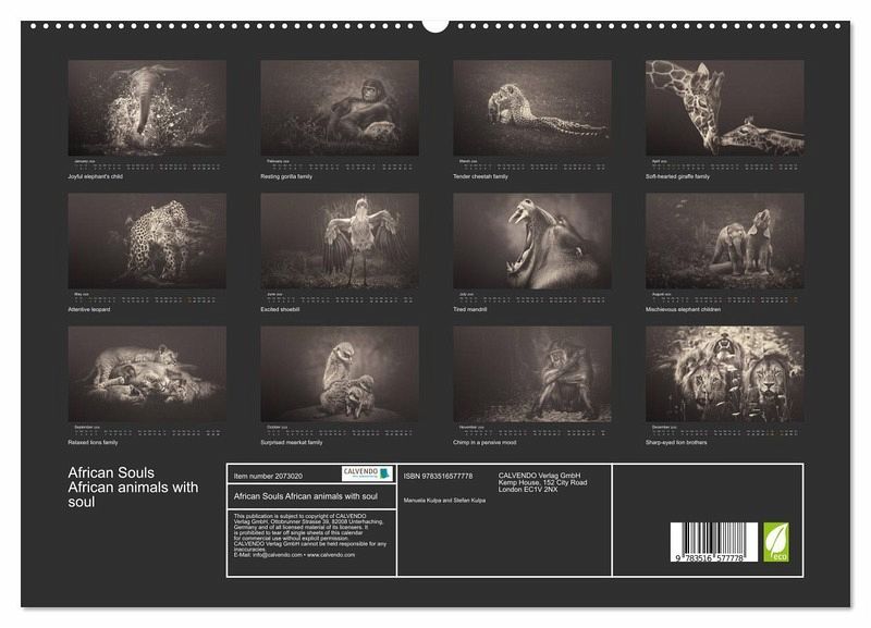 PREMIUM COLLECTION - Brilliant photo calendar with 12 beautiful motifs, high-gloss art print in museum quality.QUALITY - high-quality materials, sturdy back cover with 2 innovative insert pockets for optimum presentation on the wall.SUSTAINABLE - significant reduction in waste thanks to customised one-off production, environmentally friendly FSC-certified paper, production in Germany, climate-conscious logistics.PERFECT GIFT - calendars for friends and family, for children and adults, young and old, for Christmas, birthdays or in between.Enchanting animal souls of african nature von Autor(in): Manuela Kulpa