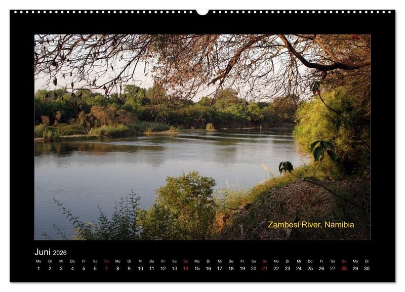 Ein Kalender für Liebhaber Afrikas. Gezeigt werden die Sandwüste Namibias, die Flusstäler und Fälle des Orange Rivers in Namibia und Südafrika, der Zambesi River, die Victoria-Fälle in Sambia und Simbabwe, der Kwando River zwischen Namibia und Botswana, eine Farm in den Cederbergen, die blühende Halbwüste Namaqualand in Südafrika und ein Canyon inmitten der namibischen Wüste.