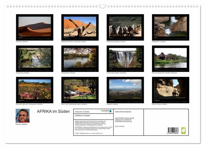 QUALITÄT - Hochwertiger Fotokalender mit 12 wunderschönen Motiven auf lichtbeständigem Bilderdruckpapier, robuste Spiralbindung mit Aufhängebügel.NACHHALTIG - deutliche Abfallreduzierung durch bedarfsgerechte Einzelstückfertigung, umweltfreundliches FSC-zertifiziertes Papier, Produktion in Deutschland, klimabewusste Logistik.PERFEKTES GESCHENK - Kalender für Freunde und Familie, für Kinder und Erwachsene, jung und alt, zu Weihnachten, Geburtstag oder zwischendurch.VIELFALT - Bildkalender in verschiedenen Formaten, z.B. DIN A5, DIN A4, DIN A3 sowie DIN A2. Ob Naturmotiv, Gemälde oder Fotos, ideal für ein persönliches Wohlfühlambiente.Landschaften aus dem Süden Afrikas von Namibia über die Victoria-Fälle bis hinab zur Kaphalbinsel. von Autor(in): Richard Walliser
