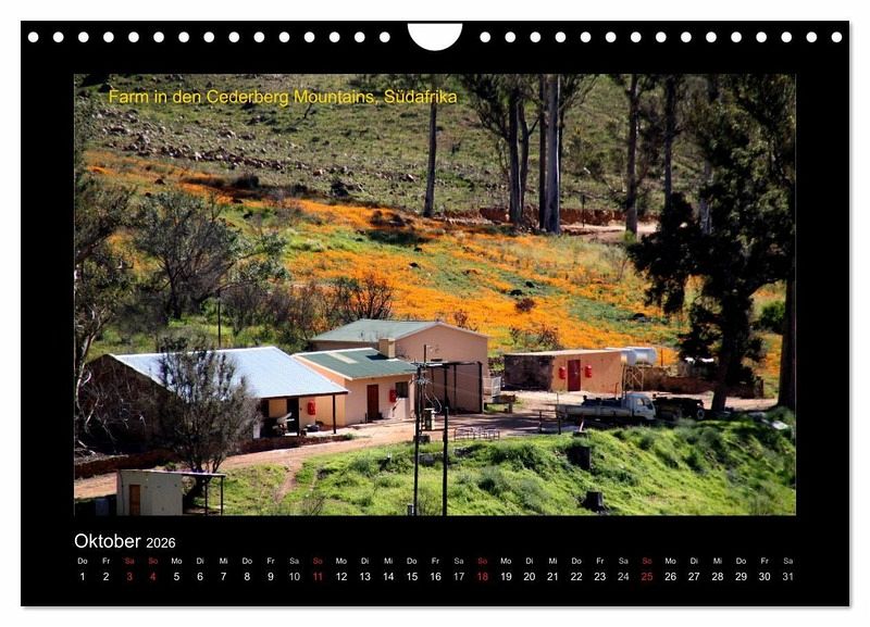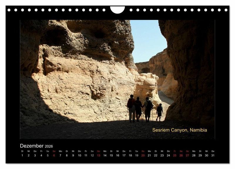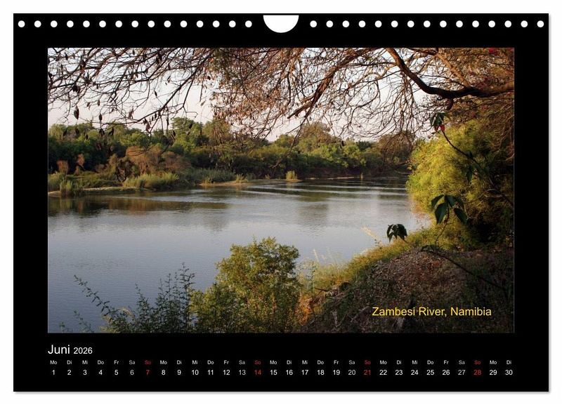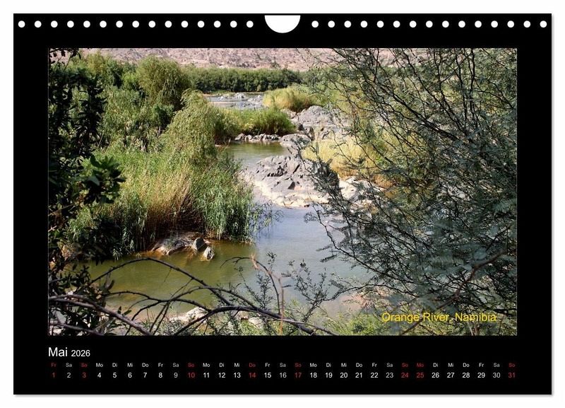 Ein Kalender für Liebhaber Afrikas. Gezeigt werden die Sandwüste Namibias, die Flusstäler und Fälle des Orange Rivers in Namibia und Südafrika, der Zambesi River, die Victoria-Fälle in Sambia und Simbabwe, der Kwando River zwischen Namibia und Botswana, eine Farm in den Cederbergen, die blühende Halbwüste Namaqualand in Südafrika und ein Canyon inmitten der namibischen Wüste.