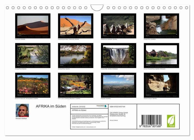 QUALITÄT - Hochwertiger Fotokalender mit 12 wunderschönen Motiven auf lichtbeständigem Bilderdruckpapier, robuste Spiralbindung mit Aufhängebügel.NACHHALTIG - deutliche Abfallreduzierung durch bedarfsgerechte Einzelstückfertigung, umweltfreundliches FSC-zertifiziertes Papier, Produktion in Deutschland, klimabewusste Logistik.PERFEKTES GESCHENK - Kalender für Freunde und Familie, für Kinder und Erwachsene, jung und alt, zu Weihnachten, Geburtstag oder zwischendurch.VIELFALT - Bildkalender in verschiedenen Formaten, z.B. DIN A5, DIN A4, DIN A3 sowie DIN A2. Ob Naturmotiv, Gemälde oder Fotos, ideal für ein persönliches Wohlfühlambiente.Landschaften aus dem Süden Afrikas von Namibia über die Victoria-Fälle bis hinab zur Kaphalbinsel. von Autor(in): Richard Walliser