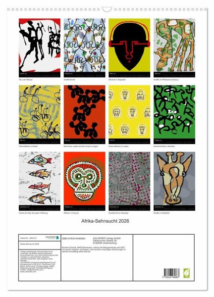 QUALITÄT - Hochwertiger Fotokalender mit 12 wunderschönen Motiven auf lichtbeständigem Bilderdruckpapier, robuste Spiralbindung mit Aufhängebügel.NACHHALTIG - deutliche Abfallreduzierung durch bedarfsgerechte Einzelstückfertigung, umweltfreundliches FSC-zertifiziertes Papier, Produktion in Deutschland, klimabewusste Logistik.PERFEKTES GESCHENK - Kalender für Freunde und Familie, für Kinder und Erwachsene, jung und alt, zu Weihnachten, Geburtstag oder zwischendurch.VIELFALT - Bildkalender in verschiedenen Formaten, z.B. DIN A5, DIN A4, DIN A3 sowie DIN A2. Ob Naturmotiv, Gemälde oder Fotos, ideal für ein persönliches Wohlfühlambiente.Eine Reise durch Afrika in Zeichnungen von Autor(in): Norbert Schmitt