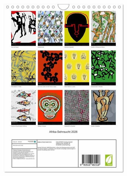 QUALITÄT - Hochwertiger Fotokalender mit 12 wunderschönen Motiven auf lichtbeständigem Bilderdruckpapier, robuste Spiralbindung mit Aufhängebügel.NACHHALTIG - deutliche Abfallreduzierung durch bedarfsgerechte Einzelstückfertigung, umweltfreundliches FSC-zertifiziertes Papier, Produktion in Deutschland, klimabewusste Logistik.PERFEKTES GESCHENK - Kalender für Freunde und Familie, für Kinder und Erwachsene, jung und alt, zu Weihnachten, Geburtstag oder zwischendurch.VIELFALT - Bildkalender in verschiedenen Formaten, z.B. DIN A5, DIN A4, DIN A3 sowie DIN A2. Ob Naturmotiv, Gemälde oder Fotos, ideal für ein persönliches Wohlfühlambiente.Eine Reise durch Afrika in Zeichnungen von Autor(in): Norbert Schmitt