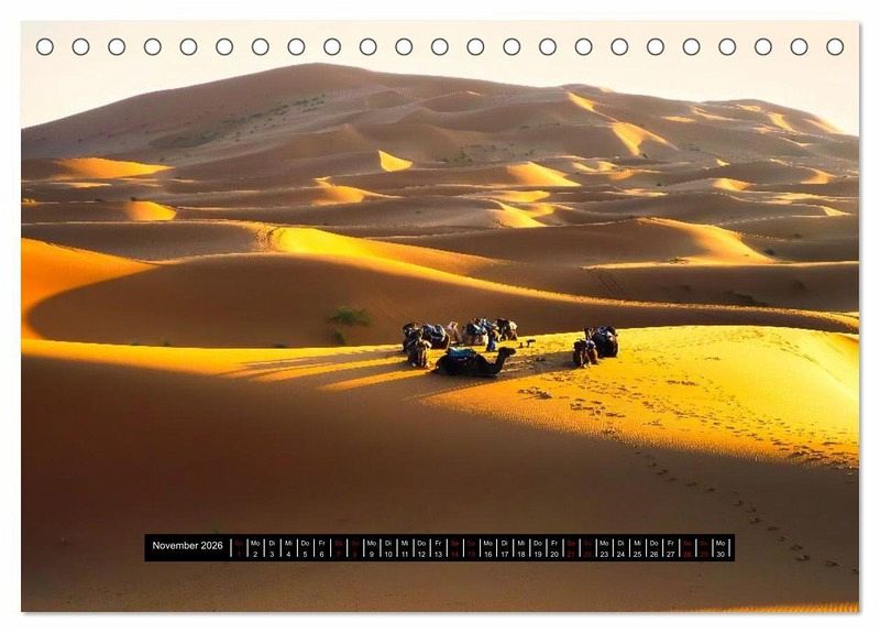 November: Kamele und leuchtende Dünen im Sonnenuntergang