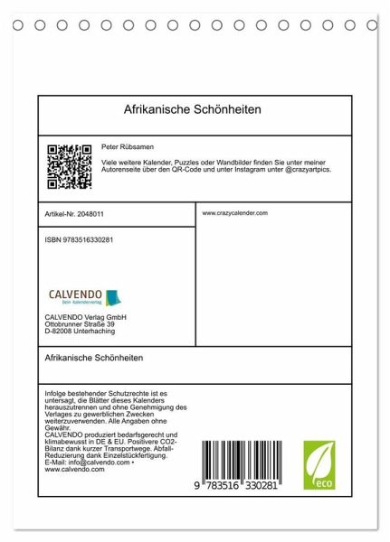 QUALITÄT - Hochwertiger Fotokalender mit 12 wunderschönen Motiven auf lichtbeständigem Bilderdruckpapier, robuste Spiralbindung.NACHHALTIG - deutliche Abfallreduzierung durch bedarfsgerechte Einzelstückfertigung, umweltfreundliches FSC-zertifiziertes Papier, Produktion in Deutschland, klimabewusste Logistik.PERFEKTES GESCHENK - Kalender für Freunde und Familie, für Kinder und Erwachsene, jung und alt, zu Weihnachten, Geburtstag oder zwischendurch.VIELFALT - Bildkalender in verschiedenen Formaten, z.B. DIN A5, DIN A4, DIN A3 sowie DIN A2. Ob Naturmotiv, Gemälde oder Fotos, ideal für ein persönliches Wohlfühlambiente.Kunstvoll gestaltete Designs von Frauen aus Afrika für alle Afrikaliebhaber von Autor(in): Peter Rübsamen