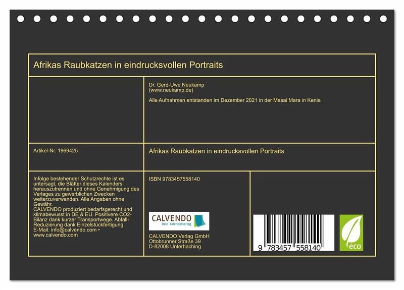 QUALITÄT - Hochwertiger Fotokalender mit 12 wunderschönen Motiven auf lichtbeständigem Bilderdruckpapier, robuste Spiralbindung.NACHHALTIG - deutliche Abfallreduzierung durch bedarfsgerechte Einzelstückfertigung, umweltfreundliches FSC-zertifiziertes Papier, Produktion in Deutschland, klimabewusste Logistik.PERFEKTES GESCHENK - Kalender für Freunde und Familie, für Kinder und Erwachsene, jung und alt, zu Weihnachten, Geburtstag oder zwischendurch.VIELFALT - Bildkalender in verschiedenen Formaten, z.B. DIN A5, DIN A4, DIN A3 sowie DIN A2. Ob Naturmotiv, Gemälde oder Fotos, ideal für ein persönliches Wohlfühlambiente.Eindrucksvolle hochauflösende Portraits von Afrikas faszienierenden Raubkatzen von Autor(in): Gerd-Uwe Neukamp