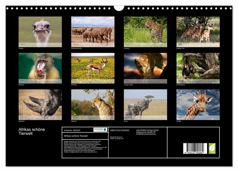 QUALITÄT - Hochwertiger Fotokalender mit 12 wunderschönen Motiven auf lichtbeständigem Bilderdruckpapier, robuste Spiralbindung mit Aufhängebügel.NACHHALTIG - deutliche Abfallreduzierung durch bedarfsgerechte Einzelstückfertigung, umweltfreundliches FSC-zertifiziertes Papier, Produktion in Deutschland, klimabewusste Logistik.PERFEKTES GESCHENK - Kalender für Freunde und Familie, für Kinder und Erwachsene, jung und alt, zu Weihnachten, Geburtstag oder zwischendurch.VIELFALT - Bildkalender in verschiedenen Formaten, z.B. DIN A5, DIN A4, DIN A3 sowie DIN A2. Ob Naturmotiv, Gemälde oder Fotos, ideal für ein persönliches Wohlfühlambiente.Die vielfältige Tierwelt Afrikas ganz nah bestaunen von Autor(in): Elisabeth Stanzer