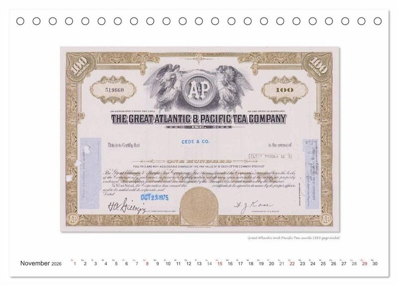 QUALITÄT - Hochwertiger Fotokalender mit 12 wunderschönen Motiven auf lichtbeständigem Bilderdruckpapier, robuste Spiralbindung.NACHHALTIG - deutliche Abfallreduzierung durch bedarfsgerechte Einzelstückfertigung, umweltfreundliches FSC-zertifiziertes Papier, Produktion in Deutschland, klimabewusste Logistik.PERFEKTES GESCHENK - Kalender für Freunde und Familie, für Kinder und Erwachsene, jung und alt, zu Weihnachten, Geburtstag oder zwischendurch.VIELFALT - Bildkalender in verschiedenen Formaten, z.B. DIN A5, DIN A4, DIN A3 sowie DIN A2. Ob Naturmotiv, Gemälde oder Fotos, ideal für ein persönliches Wohlfühlambiente.Wertvolle alte amerikanische Aktien wurden zu einem ansprechenden Kalender gestaltet. von Autor(in): Ingo Gerlach
