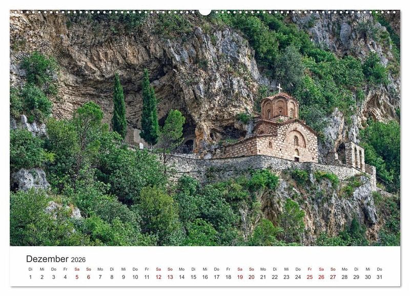 Dezember: Die St. Michaeliskirche, eine Felsenkapelle am Hang des Burgbergs über Berat.