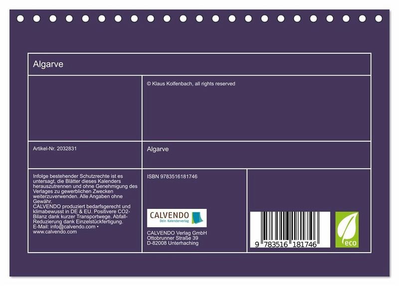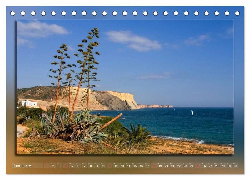 Dieser Monatskalender beinhaltet 13 Fotografien, die im Bereich der westlichen Algarve (Portugal) zwischen Sagres und Faro entstanden sind. Fotografiert wurde an den Orten Luz, Lagos, Burgau, Cavacos (Quarteira), Carvoeiro, Olhos de Agua, Albufeira, Alvor und Ferragudo (Titelbild).