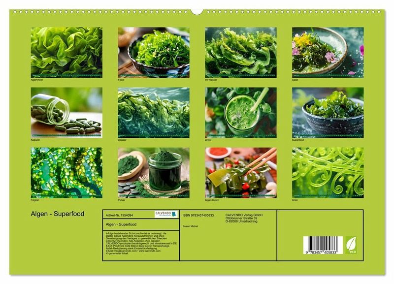 PREMIUM-LINIE - Brillanter Fotokalender mit 12 wunderschönen Motiven, Kunstdruck in Hochglanz in Museumsqualität.QUALITÄT - edle Materialien, stabile Rückwand mit 2 innovativen Einstecktaschen für eine optimale Präsentation an der Wand.NACHHALTIG - deutliche Abfallreduzierung durch bedarfsgerechte Einzelstückfertigung, umweltfreundliches FSC-zertifiziertes Papier, Produktion in Deutschland, klimabewusste Logistik.PERFEKTES GESCHENK - Kalender für Freunde und Familie, für Kinder und Erwachsene, jung und alt, zu Weihnachten, Geburtstag oder zwischendurch.Algen: Die grüne Powerquelle für deine Gesundheit! von Autor(in): Susan Michel