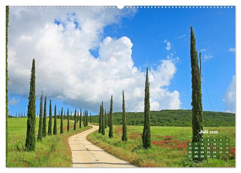 Juli: Weg zu einem Landhaus, gesäumt von einer Allee von Zypressen (Cupressus sempervirens), Toskana, Italien