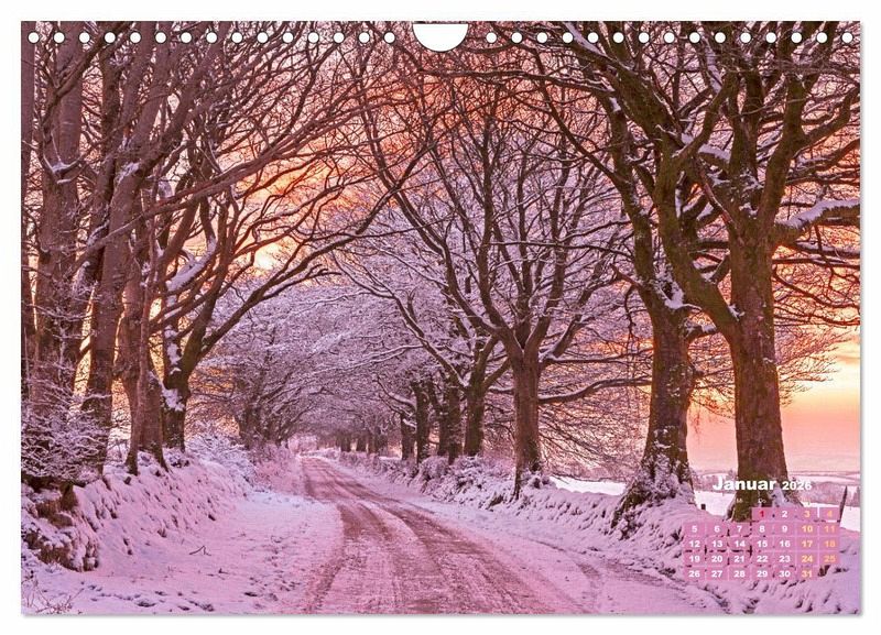 Januar: Verschneite Allee bei farbenprächtigem Sonnenuntergang, Winter im Exmoor Nationalpark, Großbritannien