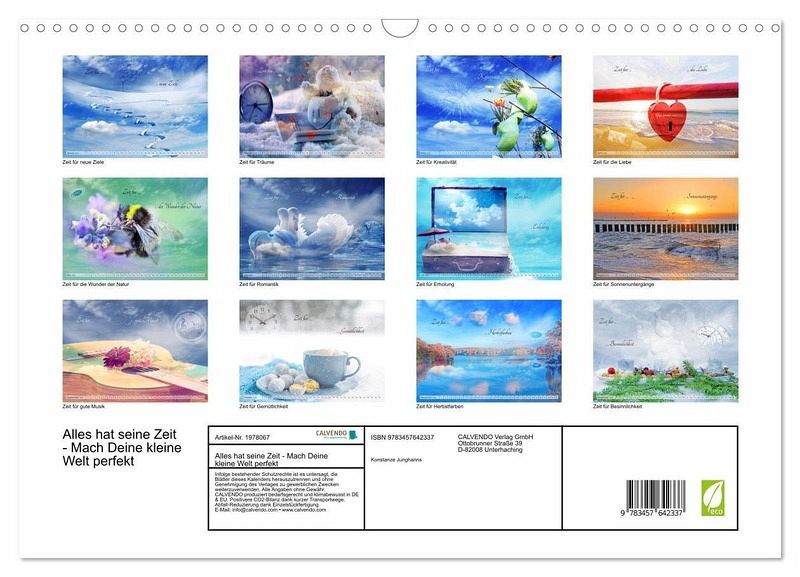 Zeit ist endlos. Aber für viele ist sie knapp und voller Stress. Lass Dich animieren, Dir mehr Zeit für Dinge zu nehmen, die Dir wichtig sind. Mach mal langsam und genieße das Leben. Dieser Kalender begleitet Dich ein ganzes Jahr, jeder Monat eröffnet Dir neue Möglichkeiten. Nehme sie an und mach Deine Welt perfekt (alle Bilder wurden durch Doppelbelichtung erstellt).