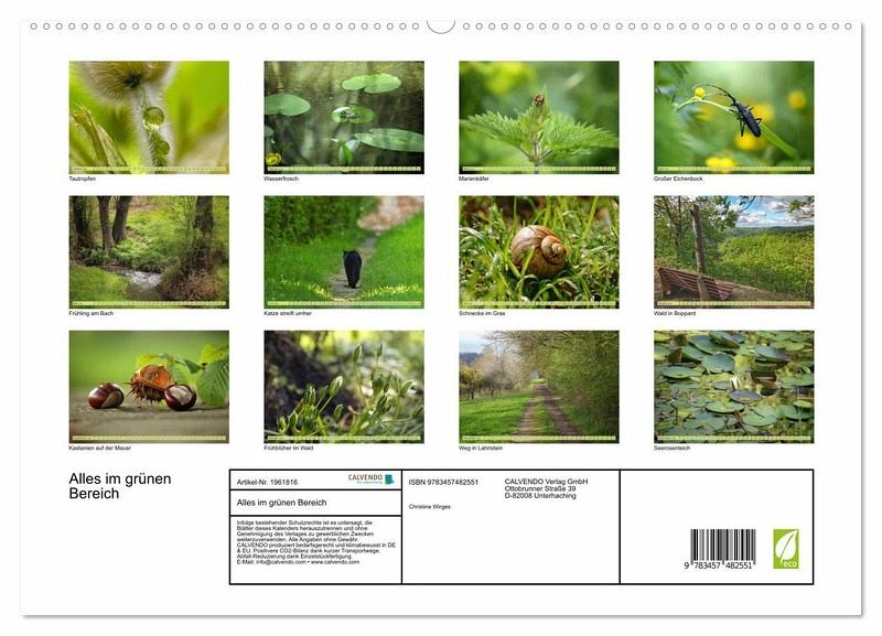 PREMIUM-LINIE - Brillanter Fotokalender mit 12 wunderschönen Motiven, Kunstdruck in Hochglanz in Museumsqualität.QUALITÄT - edle Materialien, stabile Rückwand mit 2 innovativen Einstecktaschen für eine optimale Präsentation an der Wand.NACHHALTIG - deutliche Abfallreduzierung durch bedarfsgerechte Einzelstückfertigung, umweltfreundliches FSC-zertifiziertes Papier, Produktion in Deutschland, klimabewusste Logistik.PERFEKTES GESCHENK - Kalender für Freunde und Familie, für Kinder und Erwachsene, jung und alt, zu Weihnachten, Geburtstag oder zwischendurch.Impressionen in grün von Autor(in): Christine Wirges