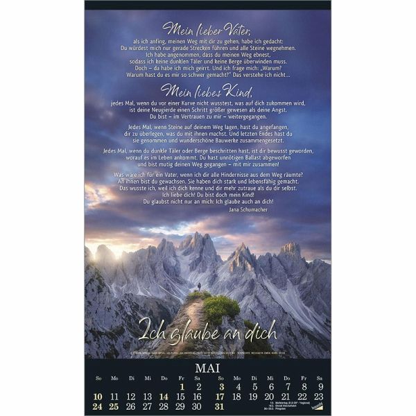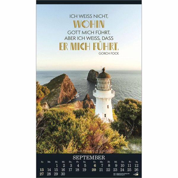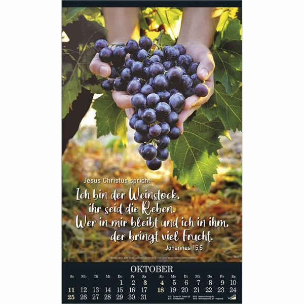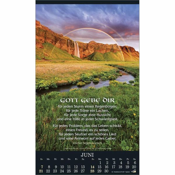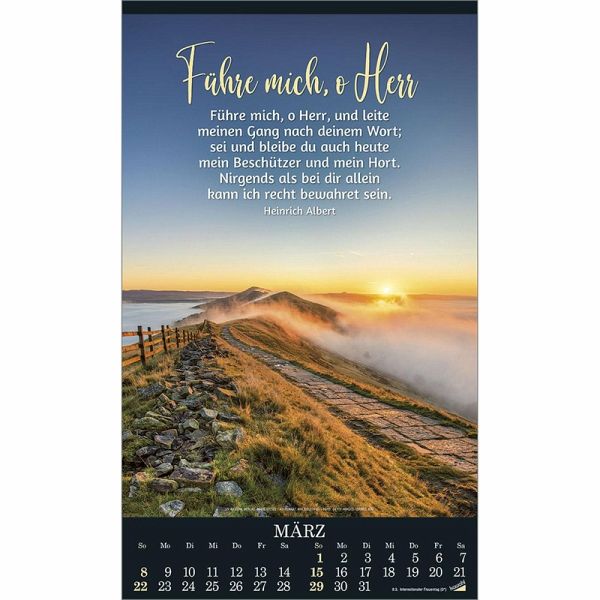 Top-Kalender: Wunderschöner WandschmuckSeit vielen Jahren willkommen ist dieser abwechslungsreiche und doch unverwechselbare Kalender mit aussagestarken Foto-Postern.Sorgfältig ausgewählte Texte und hervorragende Bilder sind sein Markenzeichen.Sie möchten zum Staunen anregen über die Wunder, die uns in der Schöpfung begegnen. In ihrer Vielfalt wollen sie den Glauben erlebbar machen.Wand-Kalender:- mit christlichen Texten und Bibelversen- mit aussagestarken Fotos- Kunstdruck