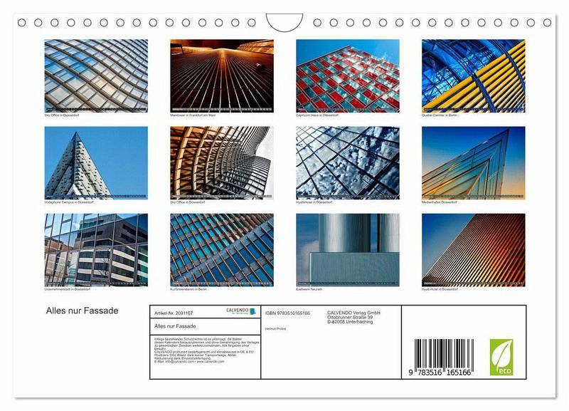 QUALITÄT - Hochwertiger Fotokalender mit 12 wunderschönen Motiven auf lichtbeständigem Bilderdruckpapier, robuste Spiralbindung mit Aufhängebügel.NACHHALTIG - deutliche Abfallreduzierung durch bedarfsgerechte Einzelstückfertigung, umweltfreundliches FSC-zertifiziertes Papier, Produktion in Deutschland, klimabewusste Logistik.PERFEKTES GESCHENK - Kalender für Freunde und Familie, für Kinder und Erwachsene, jung und alt, zu Weihnachten, Geburtstag oder zwischendurch.VIELFALT - Bildkalender in verschiedenen Formaten, z.B. DIN A5, DIN A4, DIN A3 sowie DIN A2. Ob Naturmotiv, Gemälde oder Fotos, ideal für ein persönliches Wohlfühlambiente.Grafisch anmutende Fotos von Fassaden moderner Architektur von Autor(in): HP-Grafik