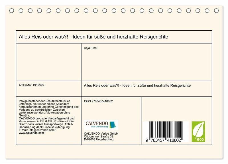 QUALITÄT - Hochwertiger Fotokalender mit 12 wunderschönen Motiven auf lichtbeständigem Bilderdruckpapier, robuste Spiralbindung.NACHHALTIG - deutliche Abfallreduzierung durch bedarfsgerechte Einzelstückfertigung, umweltfreundliches FSC-zertifiziertes Papier, Produktion in Deutschland, klimabewusste Logistik.PERFEKTES GESCHENK - Kalender für Freunde und Familie, für Kinder und Erwachsene, jung und alt, zu Weihnachten, Geburtstag oder zwischendurch.VIELFALT - Bildkalender in verschiedenen Formaten, z.B. DIN A5, DIN A4, DIN A3 sowie DIN A2. Ob Naturmotiv, Gemälde oder Fotos, ideal für ein persönliches Wohlfühlambiente.Reisgenuss: Süße und herzhafte KI-Inspirationen von Autor(in): Anja Frost