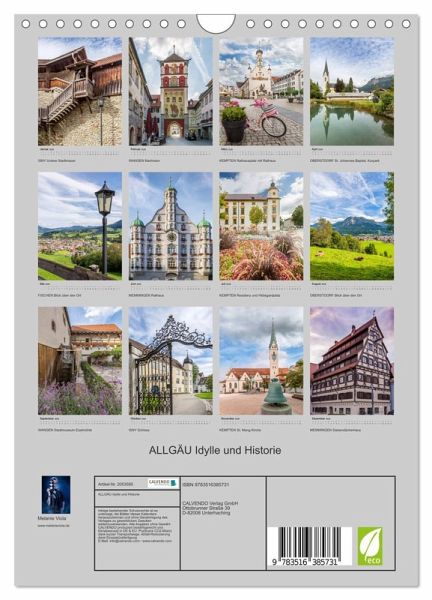 Lassen Sie sich von sechs Städten in der beliebten Urlaubsregion über das Jahr begleiten. Der Kalender führt durch die Allgäuer Orte Kempten, Isny, Fischen, Oberstdorf, Wangen und dem als Tor zum Allgäu bekannten Memmingen. Ein Spaziergang durch verwinkelte Gassen der Altstädte führt vorbei an historischen Bauten und imposanten Plätzen. Bei Wanderungen sind malerische Landschaften zu bewundern.