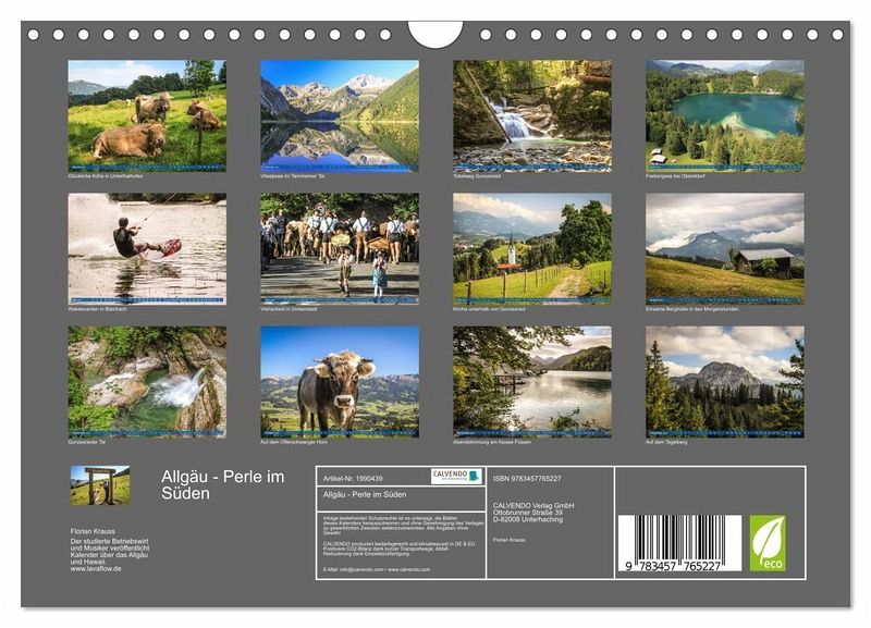 QUALITÄT - Hochwertiger Fotokalender mit 12 wunderschönen Motiven auf lichtbeständigem Bilderdruckpapier, robuste Spiralbindung mit Aufhängebügel.NACHHALTIG - deutliche Abfallreduzierung durch bedarfsgerechte Einzelstückfertigung, umweltfreundliches FSC-zertifiziertes Papier, Produktion in Deutschland, klimabewusste Logistik.PERFEKTES GESCHENK - Kalender für Freunde und Familie, für Kinder und Erwachsene, jung und alt, zu Weihnachten, Geburtstag oder zwischendurch.VIELFALT - Bildkalender in verschiedenen Formaten, z.B. DIN A5, DIN A4, DIN A3 sowie DIN A2. Ob Naturmotiv, Gemälde oder Fotos, ideal für ein persönliches Wohlfühlambiente.Berge, Seen, unberührte Natur und jede Menge Kühe bietet das Allgäu im Süden Deutschlands. von Autor(in): Florian Krauss
