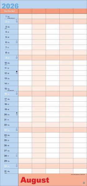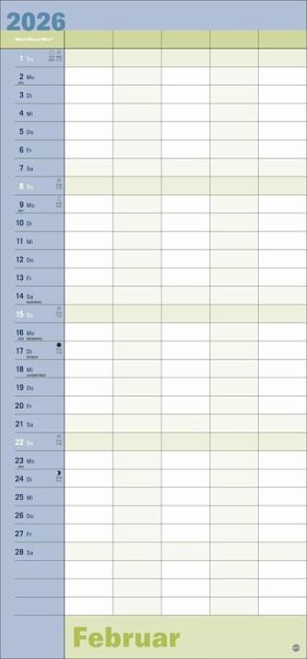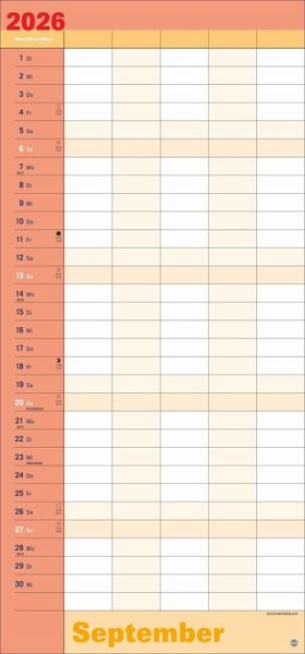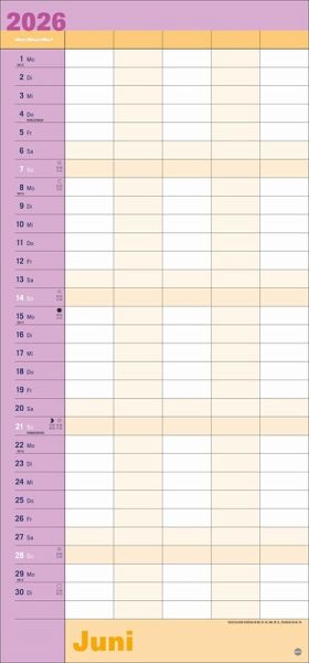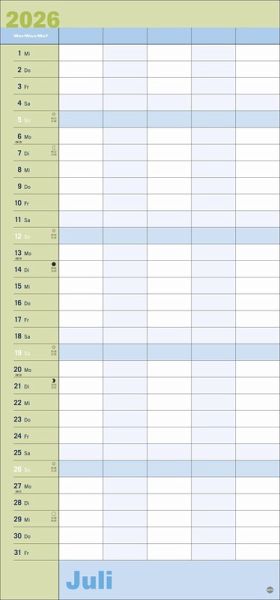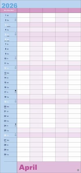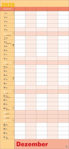 - Alle Termine im Blick: Das schlichte Design dieses Wandplaners sorgt für Übersichtlichkeit- Monatskalender 2026 mit 5 Spalten: Perfekt, um in Familie, Büro oder WG den Überblick zu behalten- Unser erfolgreiches Konzept für Familienplaner: 5 Spalten mit ausreichend Platz für alle im Haus, im bewährten 21 x 45 cm-Format- Die praktische Organisationshilfe für zuhause und Büro: Mit Schulferienübersicht und 3-Monats-Vorschau auf das neue Jahr- So macht Organisieren Spaß: Die Familien-Wandkalender von Heye aus dem Athesia Kalenderverlag