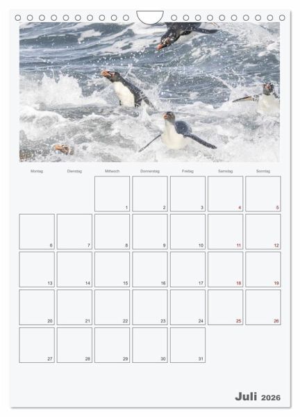 Entdecken Sie Monat für Monat eine neue Szene aus dem Alltag der Pinguine auf den Falklandinseln. Mit viel Geduld und liebevoller Beobachtung wurden diese Aufnahmen eingefangen und ausgewählt. Lassen Sie sich von der charmanten Welt der Pinguine begeistern - der perfekte Kalender für Naturliebhaber,Tierfreunde und natürlich Pinguinfans!