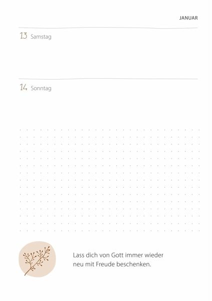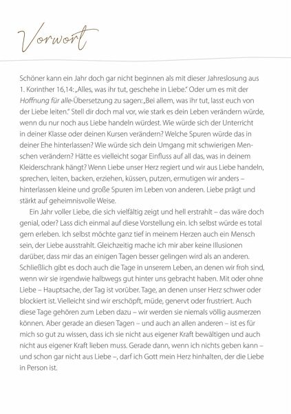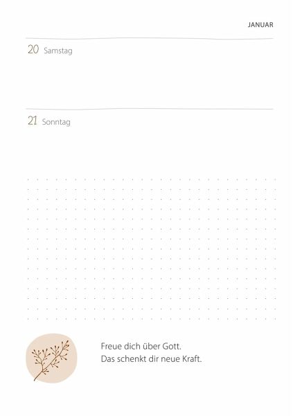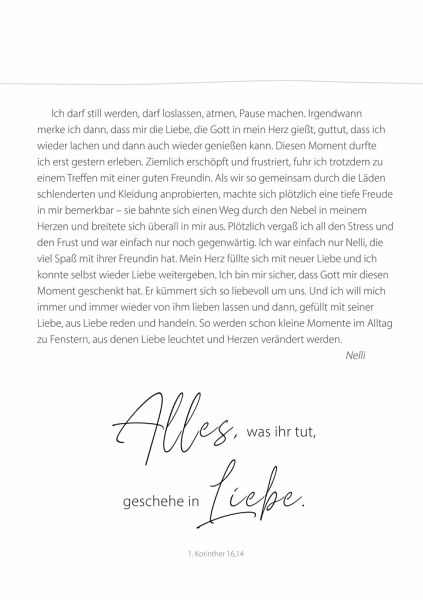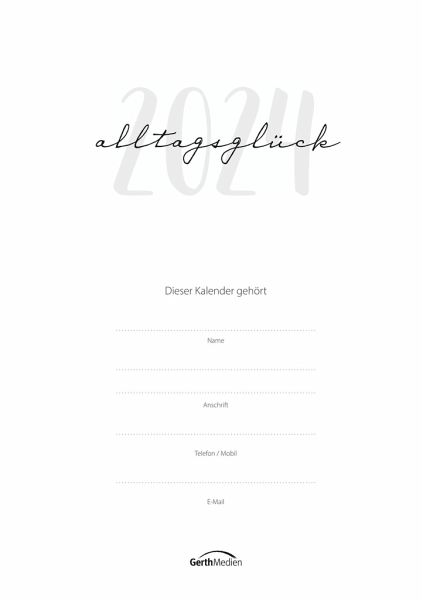 Alltagsglück 2024 - der Kalender von Nelli Bangert, die sich bereits als Buchautorin einen Namen gemacht hat. Hier findet man Andachten für jeden Monat sowie dazu passende Fragen und Umsetzungsideen in jeder Woche des Jahres. Die großzügigen Wochen- und Monatsübersichten helfen dabei, immer alles im Blick zu behalten, was gerade ansteht, und das abzuhaken, was erledigt wurde. Die Listen im Anhang (z. B. Geschenkideen, Ermutigungs-ABC, Achtsamkeitsideen) ermutigen dazu, über das nachzudenken, was uns und andere happy macht, und bestimmte Dinge nicht zu vergessen. Um große Träume und spannende Ideen kümmern sich die zahlreichen Notizseiten.