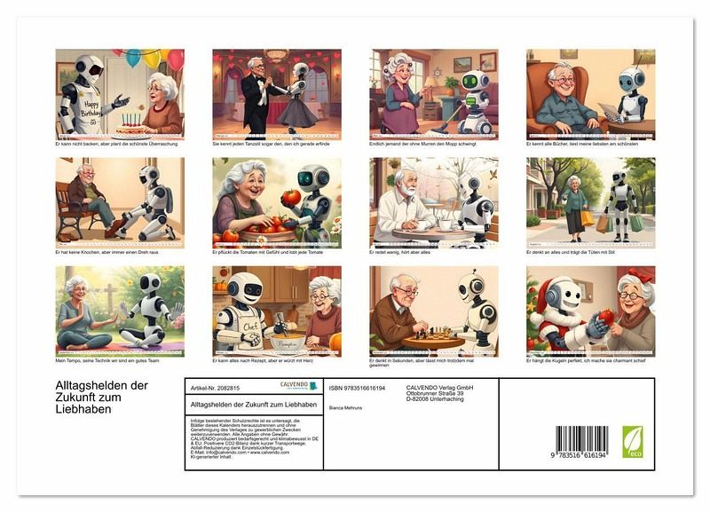 Ein Kalender voller Herzlichkeit und Humor. Vierzehn Szenen aus dem Alltag älterer Menschen zeigen, wie KI und Roboter in Zukunft helfen könnten - beim Putzen, Vorlesen, Tanzen oder im Garten. Ein liebevoller Blick auf ein modernes Miteinander von Mensch und Technik.