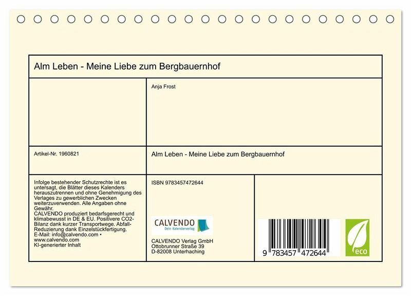 QUALITÄT - Hochwertiger Fotokalender mit 12 wunderschönen Motiven auf lichtbeständigem Bilderdruckpapier, robuste Spiralbindung.NACHHALTIG - deutliche Abfallreduzierung durch bedarfsgerechte Einzelstückfertigung, umweltfreundliches FSC-zertifiziertes Papier, Produktion in Deutschland, klimabewusste Logistik.PERFEKTES GESCHENK - Kalender für Freunde und Familie, für Kinder und Erwachsene, jung und alt, zu Weihnachten, Geburtstag oder zwischendurch.VIELFALT - Bildkalender in verschiedenen Formaten, z.B. DIN A5, DIN A4, DIN A3 sowie DINA2. Ob Naturmotiv, Gemälde oder Fotos, ideal für ein persönliches Wohlfühlambiente.Bergidylle und Almzauber in den Alpen - Ein Jahr auf dem Bergbauernhof von Autor(in): Anja Frost