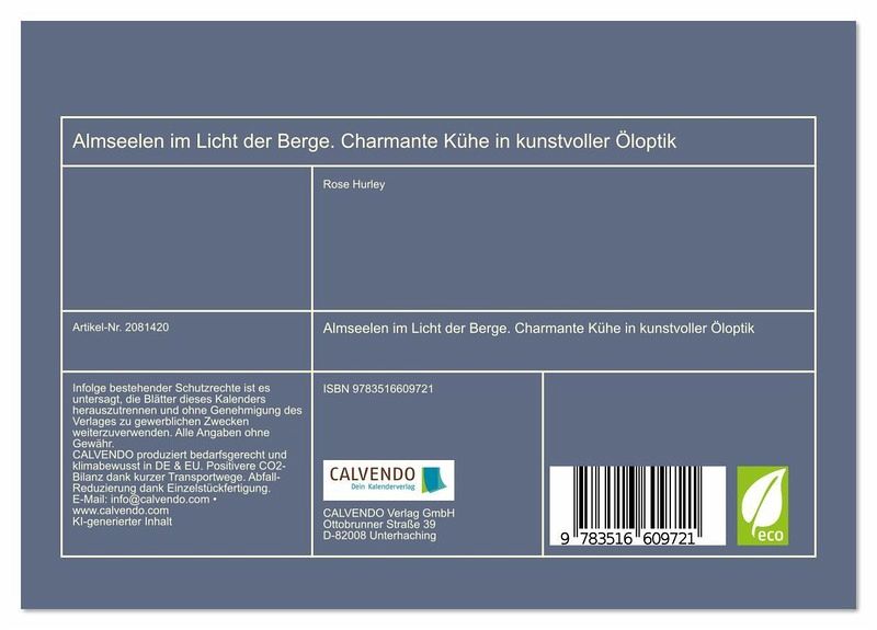 Dieser Kalender zeigt Kühe in klassischer Ölmalerei-Optik - in ihrer natürlichsten und zugleich würdevollsten Form. Jedes Motiv wurde mithilfe von KI gestaltet und zeigt die Tiere auf der Alm, umgeben von freier Natur, sanften Hügeln und schöner Berglandschaft. Die Bilder verbinden bäuerliche Romantik mit Ruhe, Kraft und Anmut. Ein besonderer Kalender für alle, die Kühe lieben - und die Stille der Berge.