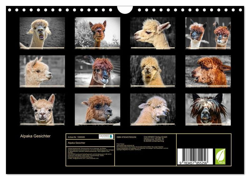 Der Fotokünstler Peter Roder hat wunderschöne Bilder der urigen Alpakas zusammengestellt und gestaltet. Ein Kalender mit lustigen Tier-Gesichtern und ein spaßiger Begleiter für jeden Tierfreund.