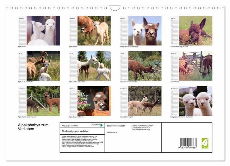 QUALITÄT - Hochwertiger Fotokalender mit 12 wunderschönen Motiven auf lichtbeständigem Bilderdruckpapier, robuste Spiralbindung mit Aufhängebügel.NACHHALTIG - deutliche Abfallreduzierung durch bedarfsgerechte Einzelstückfertigung, umweltfreundliches FSC-zertifiziertes Papier, Produktion in Deutschland, klimabewusste Logistik.PERFEKTES GESCHENK - Kalender für Freunde und Familie, für Kinder und Erwachsene, jung und alt, zu Weihnachten, Geburtstag oder zwischendurch.VIELFALT - Bildkalender in verschiedenen Formaten, z.B. DIN A5, DIN A4, DIN A3 sowie DIN A2. Ob Naturmotiv, Gemälde oder Fotos, ideal für ein persönliches Wohlfühlambiente.Süße Alpakafohlen in Aktion von Autor(in): Heidi Rentschler