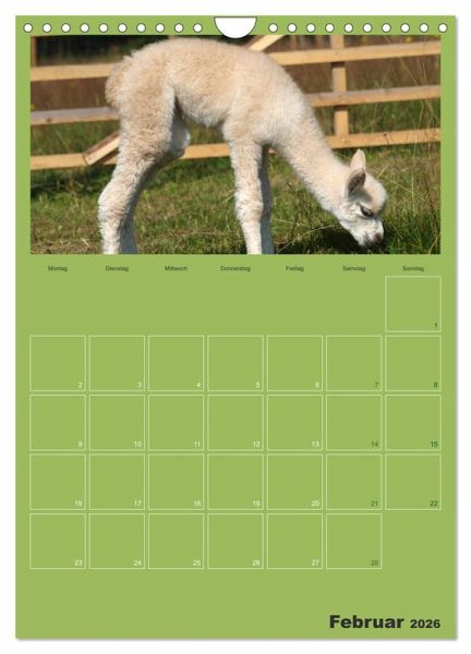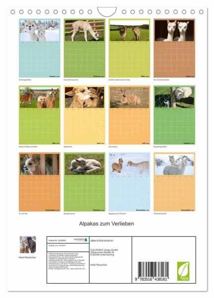 Egal ob Fohlen oder ausgewachsenes Alpaka: Mit ihrer positiven Ausstrahlung wirken sie beruhigend auf Menschen. Bringen Sie sich dieses Feeling in Ihre Wohnung durch die Bilder dieser süßen, ruhigen Tiere und halten Sie wichtige Termine in diesem Planer fest.