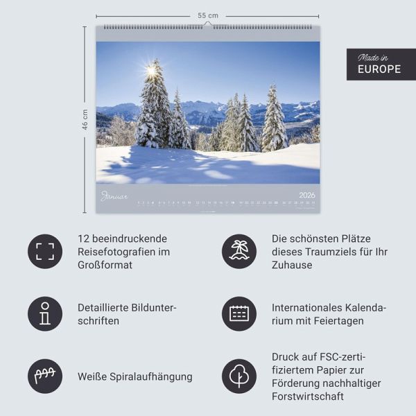 - Alpen-Fotografie auf höchstem Niveau: Die deutschen, italienischen und Schweizer Alpen von ihrer schönsten Seite- Schroffe Gipfel, stille Täler und verträumte Bergseen: Monat für Monat ein neues Bergpanorama im großen Wandkalender 2026- Alpenglühen und Morgenlicht: Lichteffekte, die es so nur in den Bergen gibt, perfekt eingefangen - Kalender im Querformat- Für Gipfelstürmer:innen und Naturbegeisterte: Stille Momente in den Alpen, die Lust auf die nächste Wanderung machen- Landschaften und Naturwunder: Die Fotokalender von Weingarten aus dem Athesia Kalenderverlag