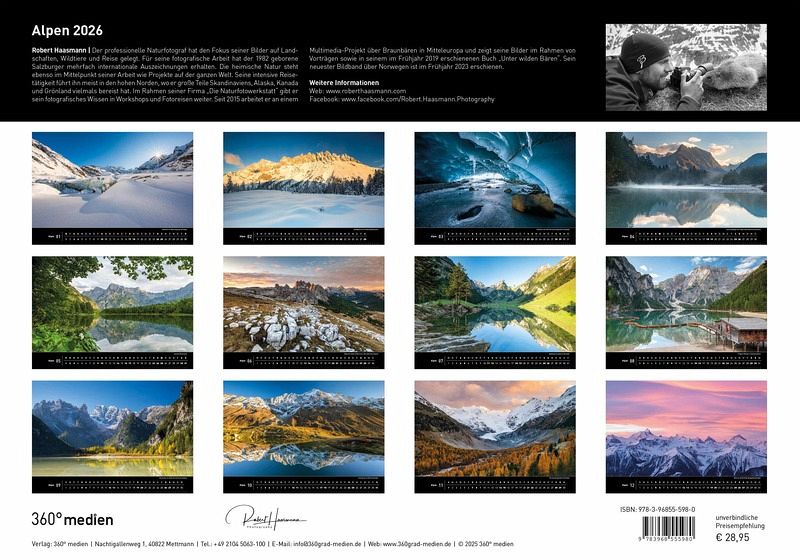 Aus traumhaften Alpen-Aufnahmen des Fotografen Robert Haasmann hat die Redaktion von 360° medien die 13 schönsten Motive ausgewählt und in diesem Kalender zusammen gestellt. Präsentiert werden die Fotos auf hochwertigem Papier im Format 50 cm x 35 cm.