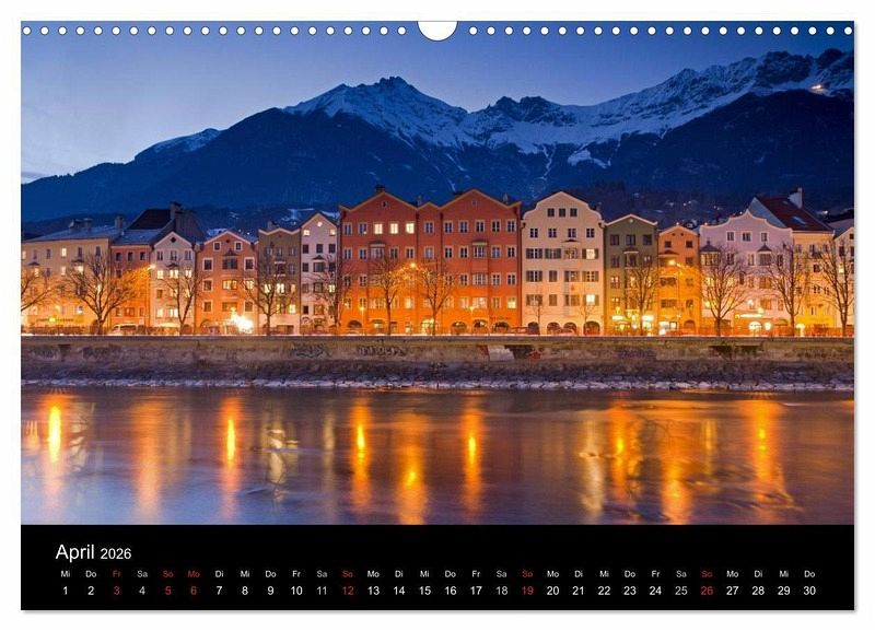 Der Kalender zeigt Fotos der Alpen. Er zeigt die Vielseitigkeit der alpinen Landschaften von sanften Hügeln in Tirol, Salzburg, Kärnten, Vorarlberg und der Steiermark in Österreich bis zu den steilen Felsspitzen in der Schweiz und den Dolomiten in Norditalien.