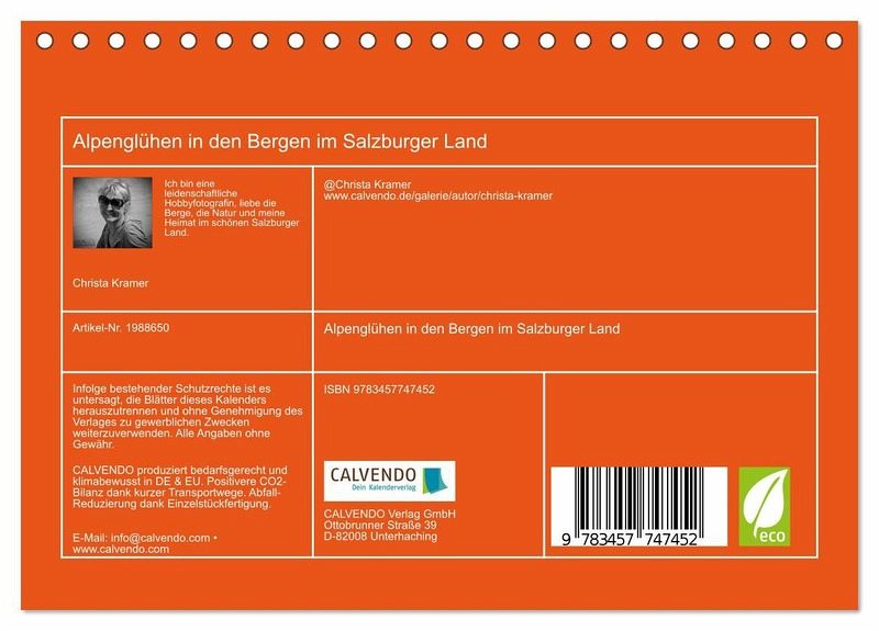 QUALITÄT - Hochwertiger Fotokalender mit 12 wunderschönen Motiven auf lichtbeständigem Bilderdruckpapier, robuste Spiralbindung.NACHHALTIG - deutliche Abfallreduzierung durch bedarfsgerechte Einzelstückfertigung, umweltfreundliches FSC-zertifiziertes Papier, Produktion in Deutschland, klimabewusste Logistik.PERFEKTES GESCHENK - Kalender für Freunde und Familie, für Kinder und Erwachsene, jung und alt, zu Weihnachten, Geburtstag oder zwischendurch.VIELFALT - Bildkalender in verschiedenen Formaten, z.B. DIN A5, DIN A4, DIN A3 sowie DIN A2. Ob Naturmotiv, Gemälde oder Fotos, ideal für ein persönliches Wohlfühlambiente.Zauberhafte Impressionen in den Bergen im Abendrot von Autor(in): Christa Kramer