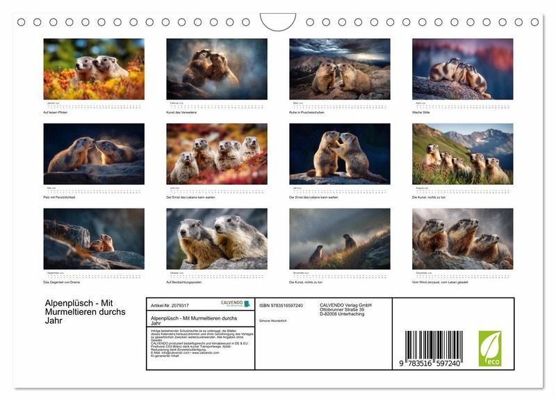 QUALITÄT - Hochwertiger Fotokalender mit 12 wunderschönen Motiven auf lichtbeständigem Bilderdruckpapier, robuste Spiralbindung mit Aufhängebügel.NACHHALTIG - deutliche Abfallreduzierung durch bedarfsgerechte Einzelstückfertigung, umweltfreundliches FSC-zertifiziertes Papier, Produktion in Deutschland, klimabewusste Logistik.PERFEKTES GESCHENK - Kalender für Freunde und Familie, für Kinder und Erwachsene, jung und alt, zu Weihnachten, Geburtstag oder zwischendurch.VIELFALT - Bildkalender in verschiedenen Formaten, z.B. DIN A5, DIN A4, DIN A3 sowie DIN A2. Ob Naturmotiv, Gemälde oder Fotos, ideal für ein persönliches Wohlfühlambiente.Heiter bis pelzig - ein Jahr mit Murmeltieren! von Autor(in): Simone Wunderlich