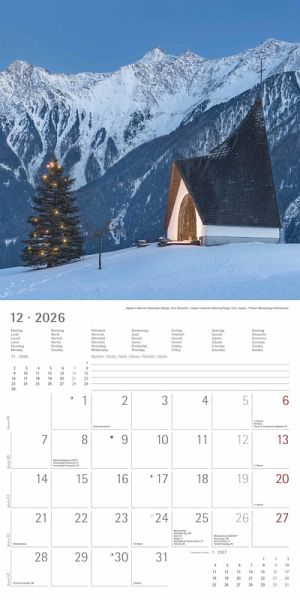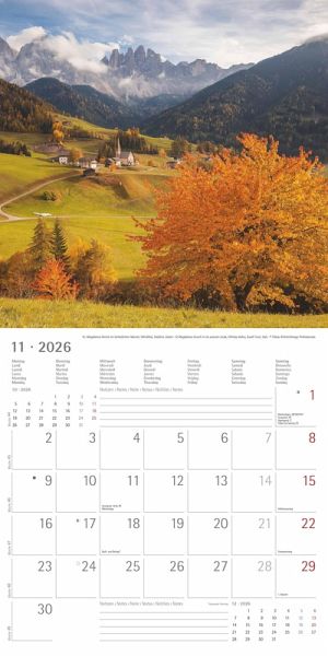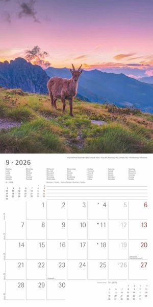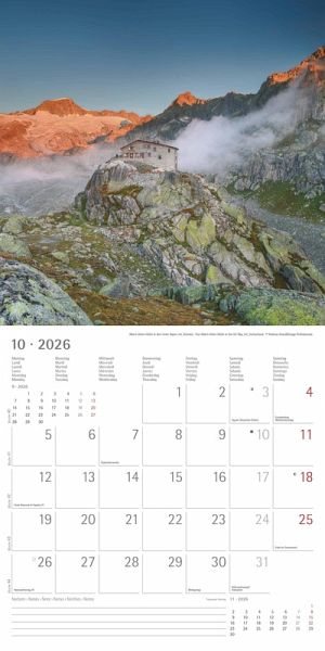Das übersichtliche Kalendarium, welches Monat für Monat zahlreiche Zusatzinformationen liefert (z. B. Monatsübersichten, Ferientermine oder Mondphasen) und auch viel Platz für Notizen bietet, fügt sich harmonisch unter den Fotomotiven an. Ob idyllisch hinter Bergseen oder umgeben von spektakulären Wolkenformationen: Der Wandkalender Alpen 2026 der Marke Alpha Edition weckt sogleich die Lust auf den nächsten Wanderurlaub.