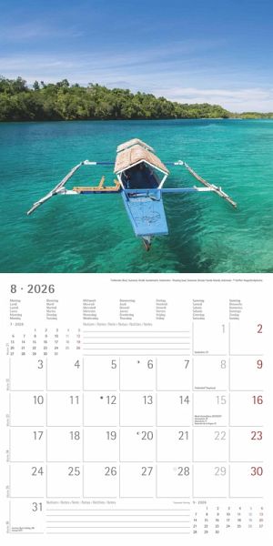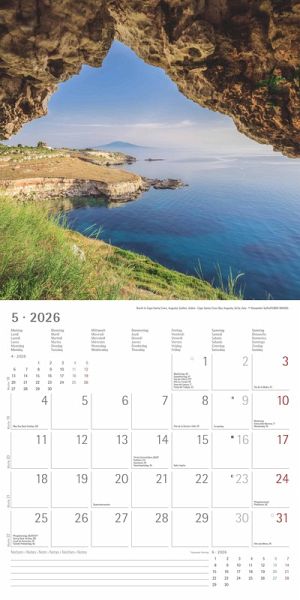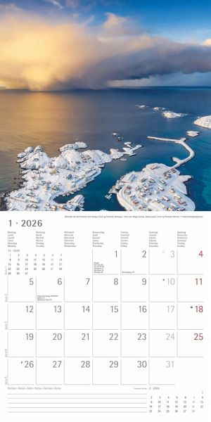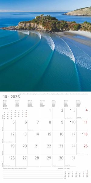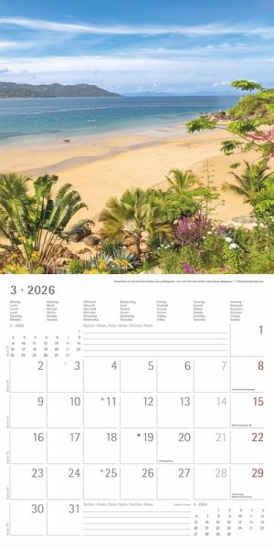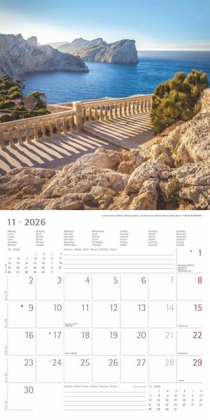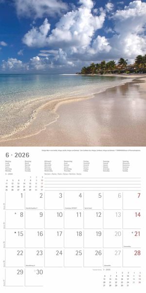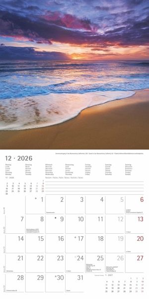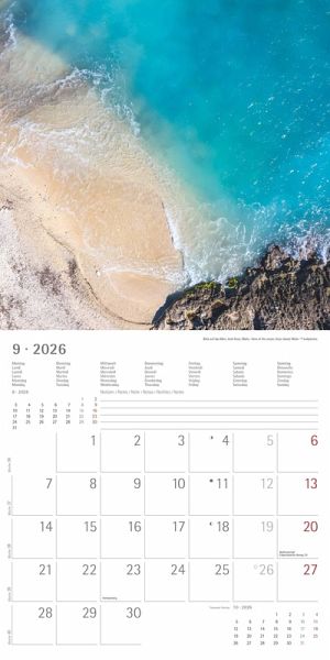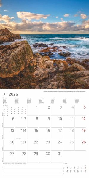 Das übersichtliche Kalendarium, welches Monat für Monat zahlreiche Zusatzinformationen liefert (z. B. Monatsübersichten, Ferientermine oder Mondphasen) und auch viel Platz für Notizen bietet, fügt sich harmonisch unter den Fotomotiven an. Lassen Sie sich vom Bildkalender Am Meer 2026 verzaubern und genießen Sie die Naturfotografien jeden Tag aufs Neue.