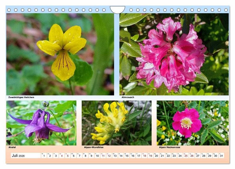 Zwischen April und September blühen in den Alpen besonders viele verschiedene Pflanzen. Vom Tal bis über die Baumgrenze hinauf gibt es so viel zu entdecken, dass dieser Kalender nur ein Vorgeschmack darauf sein kann, wenn man sich selbst auf eine Alpenblumen Wanderung macht.