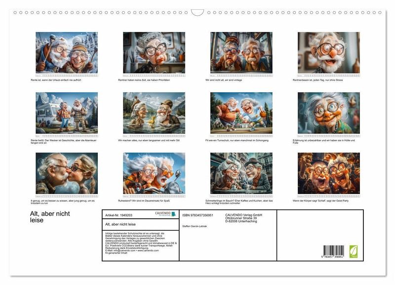 Ob wilde Abenteuer im Urlaub, charmante Eskapaden im Café oder lustige Begegnungen im Alltag. Dieser Kalender ist voller humorvoller Einblicke in das Leben der Generation, die den Ruhestand nicht als Endstation, sondern als Start in eine neue, spannende Zeit sieht. Ein Muss für alle, die über das Älterwerden herzlich lachen können! Alle hier gezeigten Bilder wurden mit Sorgfalt, Liebe und mit Hilfe einer KI generiert. Abschließend werden sie mit Bildbearbeitungsprogrammen überarbeitet und in den Kalender eingefügt.