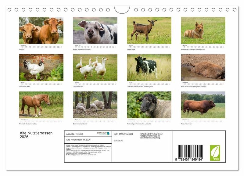 Durch Optimierung und Züchtung von Hochleistungsrassen in der modernen Landwirtschaft, sind alte Nutztierrassen bei uns selten geworden und vom Aussterben bedroht. Dieser Kalender zeigt zwölf verschiedene alte Rassen, die von der Gesellschaft zur Erhaltung alter und gefährdeter Haustierrassen e.V. (GEH) als, zum Teil extrem, gefährdet eingestuft worden sind.