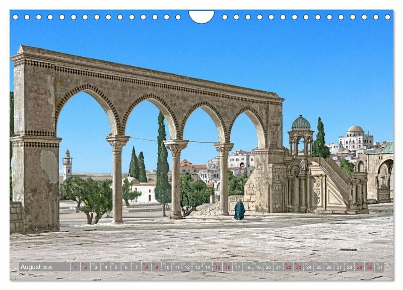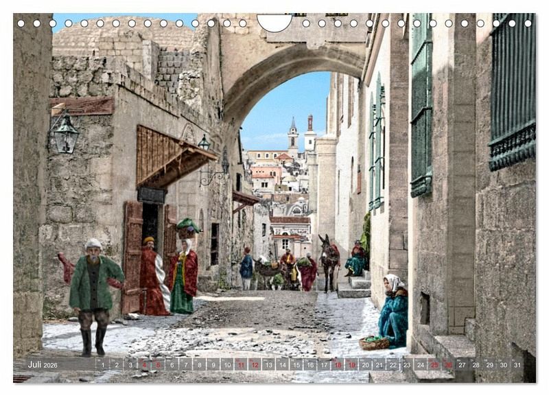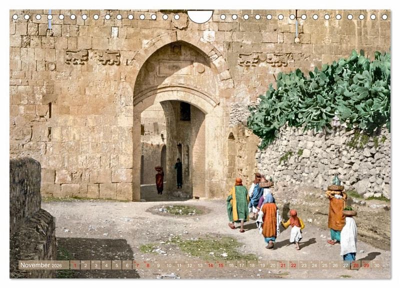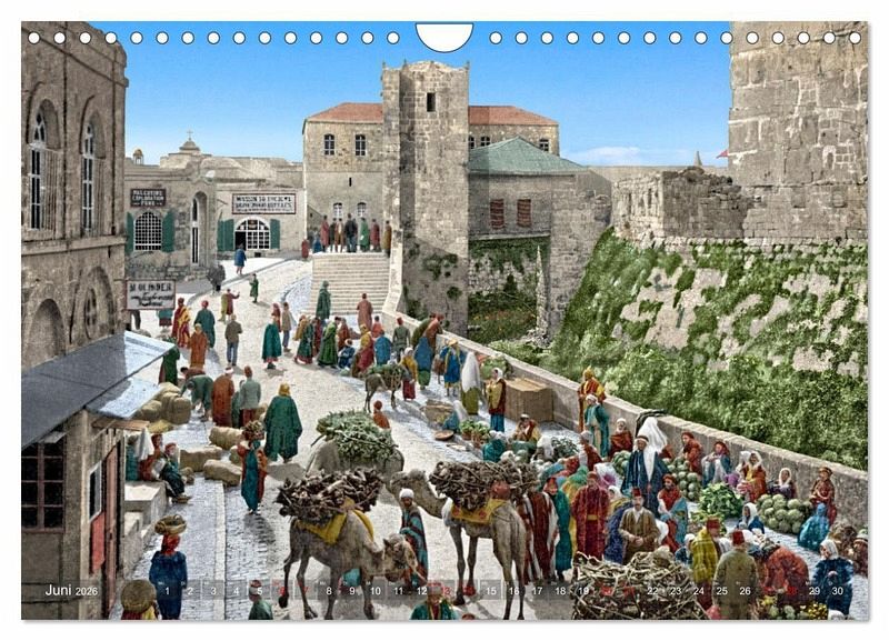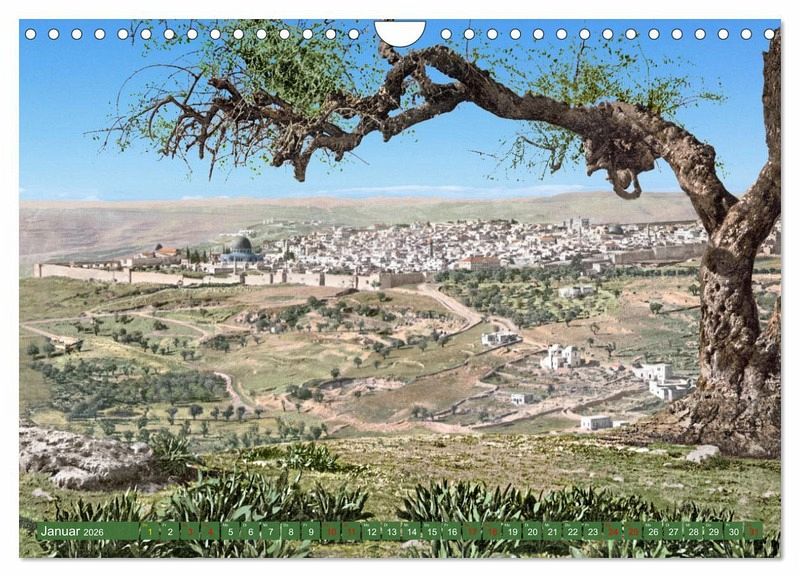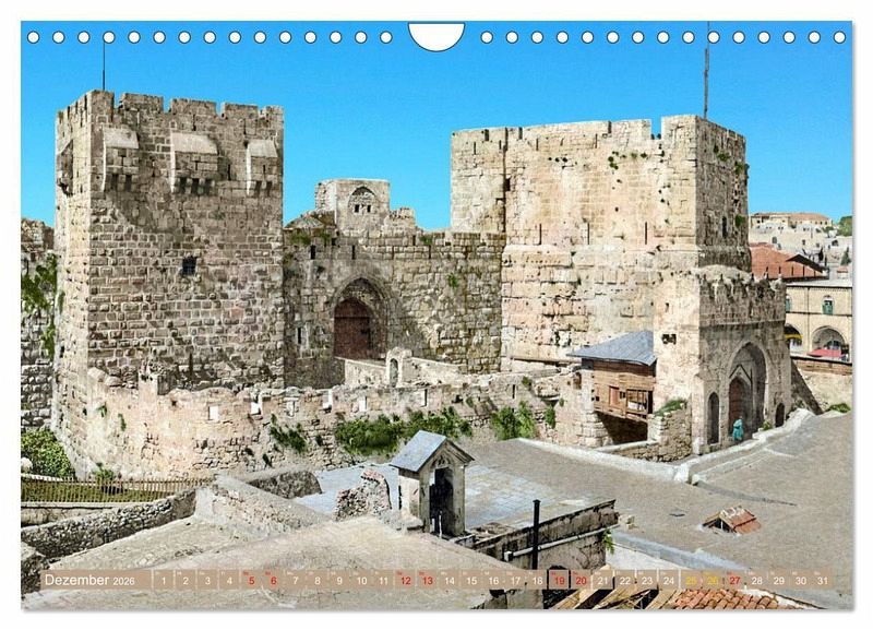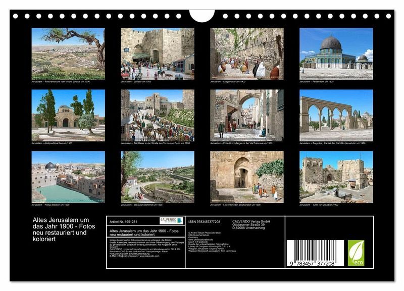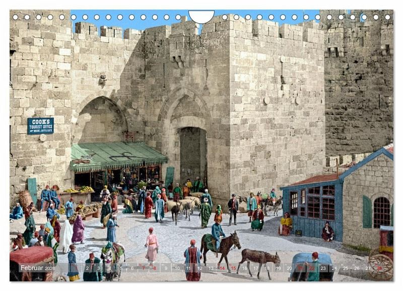 Jerusalem - Wohl kaum ein Ort hat eine so dramatische und wechselvolle Geschichte erlebt wie Jerusalem. Die "Heilige Stadt", auch als Ort von Jesu Wirkens, ist ein Kreuzpunkt der drei abrahamitischen Religionen Judentum, Christentum und Islam. Unterschiedliche Glaubenswelten treffen hier aufeinander. Von gewaltigen Mauern umgeben und durch Tore gesichert beeindruckt die Architektur. Diese farblich restaurierten und nachkolorierten Fotografien sollen einen besonderen Einblick in den Alltag der Menschen und bekannte Orte um das Jahr 1900 geben, auch wenn es in diesem inzwischen zweiten Kalender nur eine kleine Auswahl an Örtlichkeiten ist. Aber nie war diese alte Zeit so lebendig. Eine Zeitreise in Bildern. Dieser qualitativ hochwertige Kalender gehört zur exklusiven CALVENDO Gold-Edition.