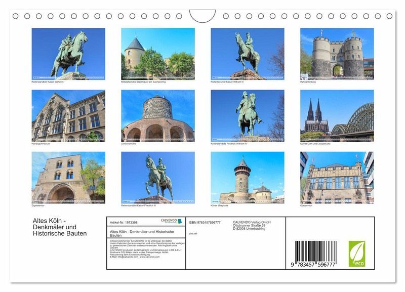 Der Kalender nimmt Sie mit auf einen Rundgang durch die Hansestadt Köln und zeigt Ihnen eine Auswahl der schönsten und prachtvollsten historischen Bauten Kölns. Eine Zeitreise von beeindruckenden Festungsanlagen, über historische Persönlichkeiten hinzu eindrucksvollen Statuen.