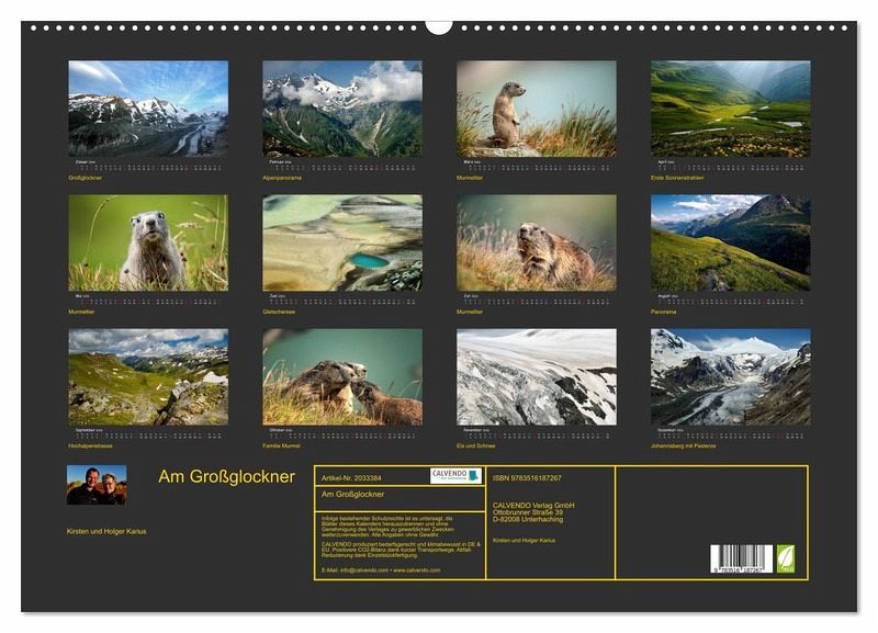 Die berühmteste Alpenstraße, die Großglockner Hochalpenstraße, führt mitten ins Herz des Nationalparks Hohe Tauern, zum höchsten Berg Österreichs, dem Großglockner (3.798 m) und seiner Pasterze! Auf 48 Kilometern Panoramastraße mit 36 Kehren, bei einem Höhenanstieg bis auf 2.504 Meter durchquert man eine einzigartige Gebirgswelt. In diesem Kalender zeigen wir ihnen nicht nur einen kleinen Ausschnitt dieser wunderschönen Landschaft, sondern auch was den Großglockner für den Tierfreund so besonders macht - Murmeltiere.