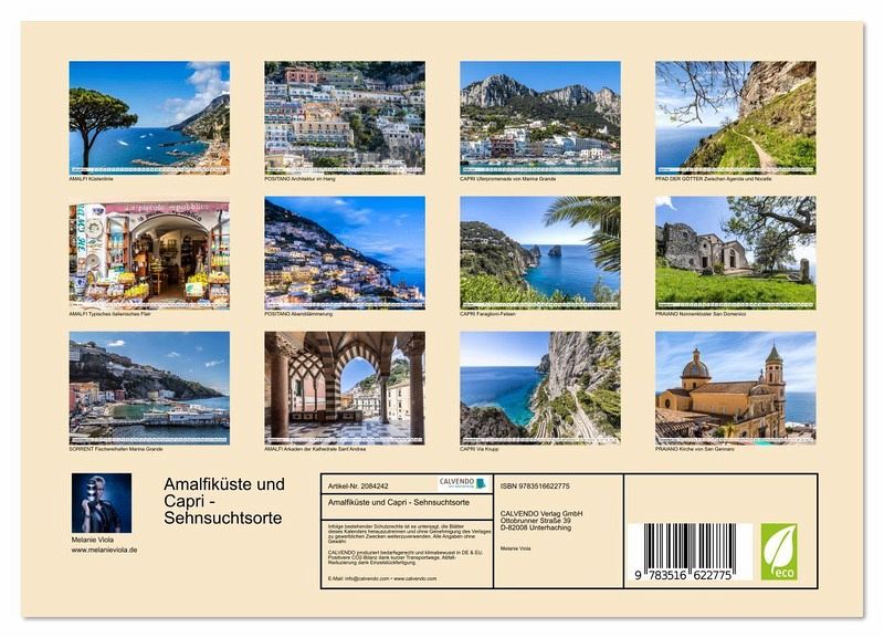 Zwischen wildromantischen Steilküsten, schroffen Felsen, üppiger Vegetation und leuchtenden Fassaden entfaltet sich ein mediterraner Zauber, der Herz und Seele berührt. Die Amalfiküste und die Insel Capri zählen zu den schönsten Küstenlandschaften Europas. Farbenfrohe Dörfer schmiegen sich an die Hänge, verwinkelte Gassen und elegante Promenaden laden zum Flanieren ein. Ein Kalender zum Träumen für alle, die das Meer und das südliche Lebensgefühl lieben.