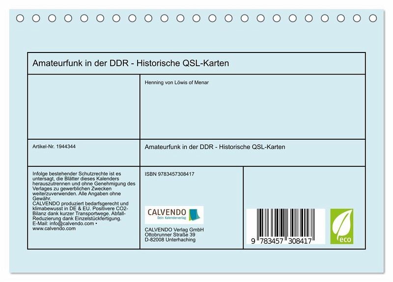 QUALITÄT - Hochwertiger Fotokalender mit 12 wunderschönen Motiven auf lichtbeständigem Bilderdruckpapier, robuste Spiralbindung.NACHHALTIG - deutliche Abfallreduzierung durch bedarfsgerechte Einzelstückfertigung, umweltfreundliches FSC-zertifiziertes Papier, Produktion in Deutschland, klimabewusste Logistik.PERFEKTES GESCHENK - Kalender für Freunde und Familie, für Kinder und Erwachsene, jung und alt, zu Weihnachten, Geburtstag oder zwischendurch.VIELFALT - Bildkalender in verschiedenen Formaten, z.B. DIN A5, DIN A4, DIN A3 sowie DIN A2. Ob Naturmotiv, Gemälde oder Fotos, ideal für ein persönliches Wohlfühlambiente.Empfangsbestätigungen von Amateurfunkstationen der DDR von Autor(in): Henning von Loewis of Menar